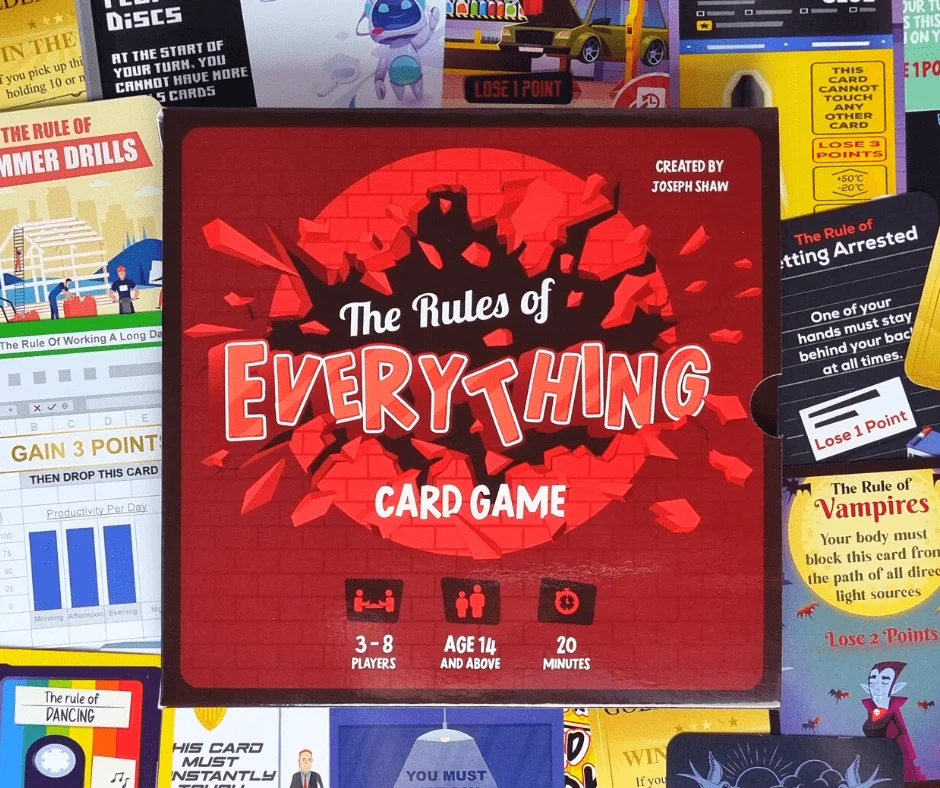 In this fast-paced card game, each player takes their turn picking up a card from the deck, reading out the rule and following that rule. Every player will have their own set of rules to follow, determined by which cards they pick up.